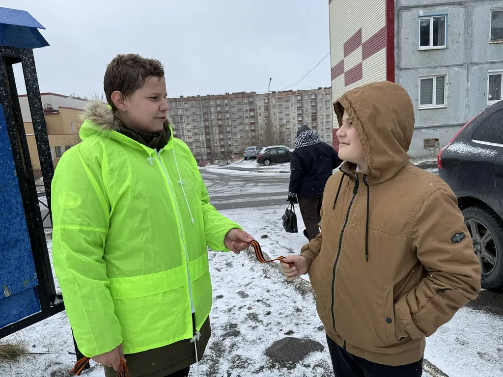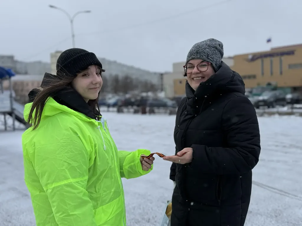 Несмотря на капризы погоды, добровольцы из объединения «Импульсы Севера» уловили момент, когда стихия немного стихла. Им удалось выйти на улицы города, чтобы вручить главные символы Победы прохожим.